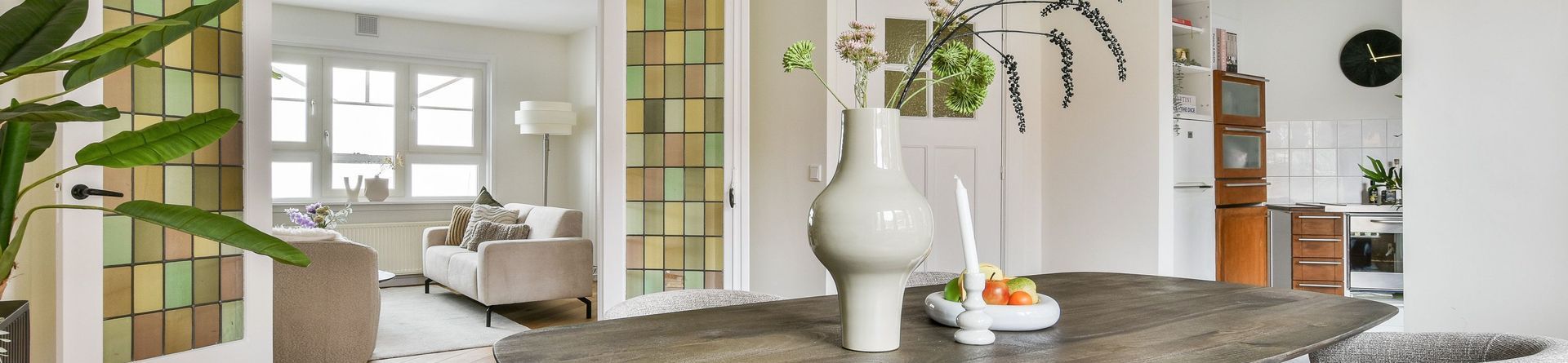 Via the communal staircase, you reach the apartment on the fourth floor. Upon entering, you arrive in a spacious hallway that provides access to all rooms. The living room is located at the front of the apartment and connects directly to the adjoining dining room. Two characteristic stained-glass doors separate these rooms in a stylish way, while still maintaining an open feel.