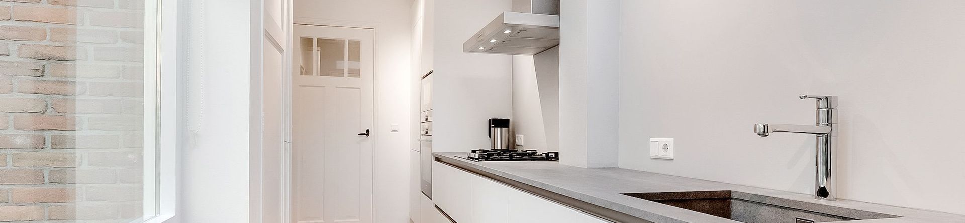 De keuken geeft toegang tot de achtergelegen bijkeuken en de achtertuin.