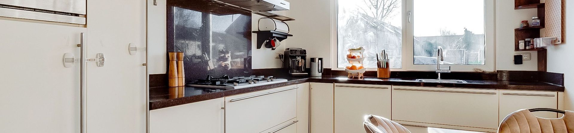 Aan de voorzijde bevindt zich de open keuken. Deze is in roomgeel uitgevoerd in een L-opstelling en voorzien van een granieten blad, koelkast, apothekerskast, 5-pits gaskookplaat (RVS), grote afzuigkap en vaatwasmachine.